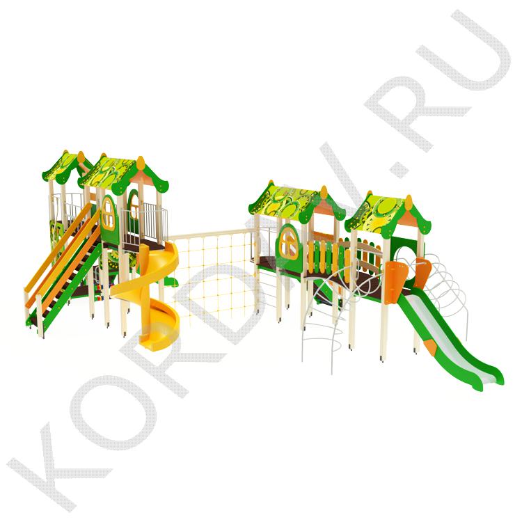 Игровой комплекс состоит из: четырёх башен,скат-горка, винтовая горка пластиковая, 3 лестниц с перилами, щит-скалолаз вертикальный с канатом, пара счет с пластиковыми кольцами, крестики-нолики на перекладинах, мост между площадками дугообразный с ограждениями, мост-труба, ровный подвесной мост, труба для вбирания из металлических колец, лаз из канатов, башни с двухскатными крышами, площадки ровные с ограждениями, лестницы вертикальные.